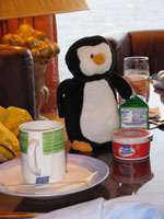 We picked up our race packages on board the first day. Besides our race numbers, we each received a fleece vest, long-sleeve technical shirt, running hat, sports bag (all with the GAMM race logo embroidered or screened, and all very high quality) and a very cute Beanie Baby penguin. More about the penguin later.