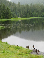 The finish line was in a beautiful spot, a camping area next to a glassy lake with fish jumping, ducks, a place to get changed, and shelters with big rock fireplaces — too bad there wasn't time to stay for a marshmallow roast! There were quite a few mosquitoes but we had bug spray handy. Other than a light mist for a short time, the rain held off and it was almost sunny: unusual for Ketchikan we were told. After we got back into town for an early afternoon departure, the rain finally set in. We were lucky to avoid it for the run!